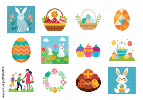 Set of Easter design elements. Easter Sunday Eggs, chicken, butterfly, rabbit, tulips bundle