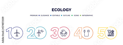 set of ecology thin line icons. ecology outline icons with infographic template. linear icons such as wind mills, wind energy, save water, solar plug, power plant vector.