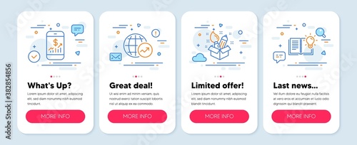 Set of Education icons, such as Creativity, Mobile finance, World statistics symbols. Mobile screen mockup banners. Product knowledge line icons. Design idea, Phone accounting, Global report. Vector