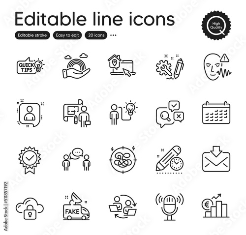 Set of Education outline icons. Contains icons as Voice wave, Stress and Business idea elements. Fake news, Project deadline, Certificate web signs. Microphone, Cloud protection. Vector