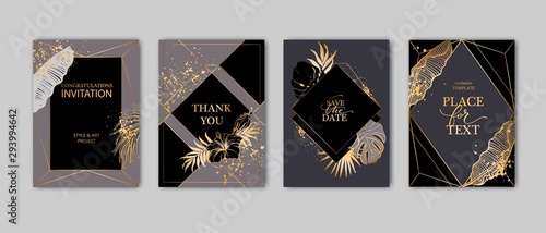 Set of elegant brochure, card, background, cover. Geometric frame. Palm, exotic leaves. Save the date, invitation, birthday card design.