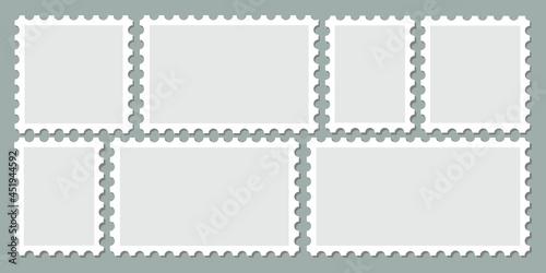 Set of empty postage stamp frame vector. Different toothed border blank mark frames. Collection pack of clean postal sticker with copy space.