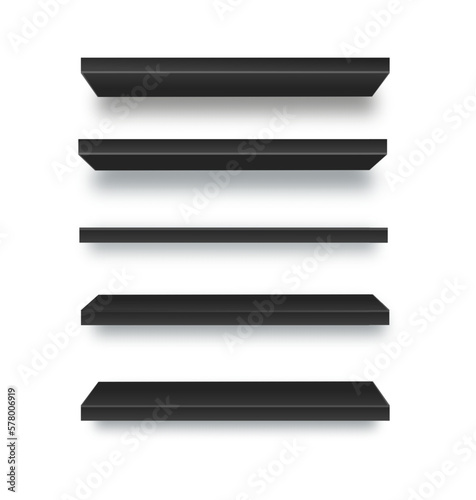 Set of empty wooden store shelves with LED lighting. Product shelf with wood texture and black wall mount. Grocery rack. Vector