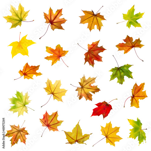 Set of falling autumn maple leaves on white background.