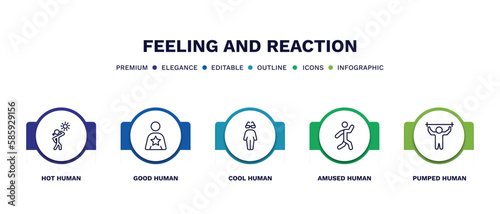 set of feeling and reaction thin line icons. feeling and reaction outline icons with infographic template. linear icons such as hot human, good human, cool human, amused pumped vector.