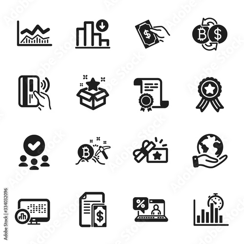 Set of Finance icons, such as Report timer, Bitcoin exchange. Certificate, approved group, save planet. Trade infochart, Contactless payment, Loyalty gift. Vector