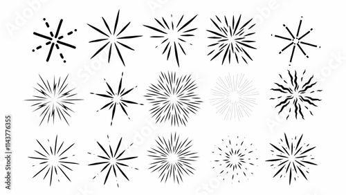 Set of fireworks explosions, black and white vector illustration isolated
