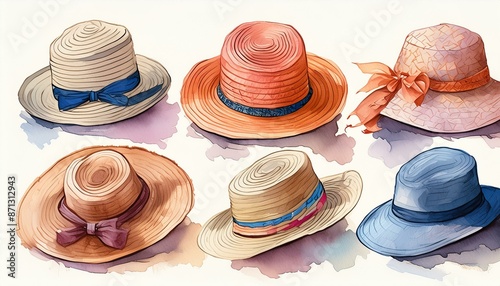 Set of five doodle sketch summer hats isolated on white background. Watercolor illustration