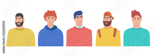 Set of flat icons with men. Male faces and shoulders avatars. Flat cartoon vector illustration.