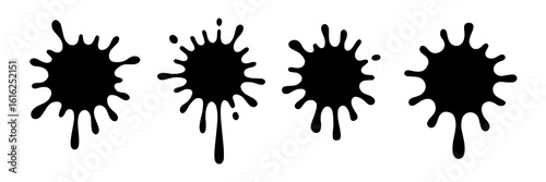 Set of four black ink splatters, blots, or splashes on a white background. Vector illustration of irregular, organic shapes; design elements for artistic backgrounds, textures, and decorations. Blac