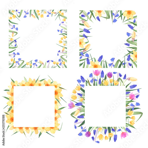 Set of four teamples - watercolor spring flowers arranged in a square template. Watercolor flower template for a wedding invitation, gift card, announcement.