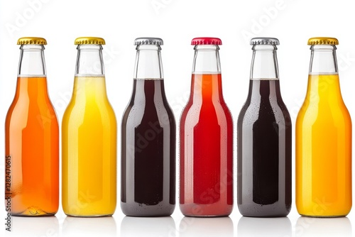 set of fresh ice cold beverage bottles isolated white background cooled water beer lemonade and soda refreshment drink collection