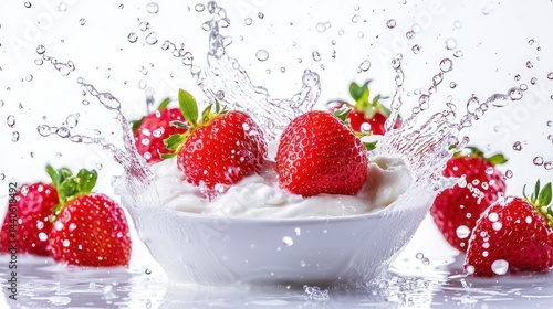 Set of fresh strawberries splashing into a bowl of thick cream on white background.