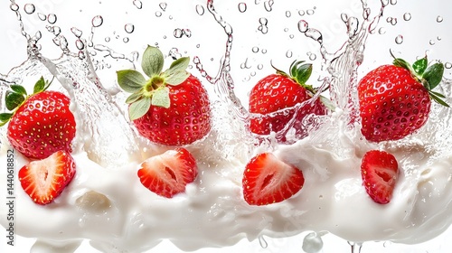 Set of fresh strawberries splashing into yogurt, with milk droplets and fruit juices on white background.