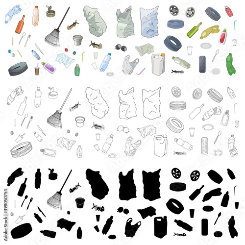 Set of garbage, plastic utensils, plastic straws, bags and wastes. Vector illustration. Hand drawn outline isolate on white backdrop.