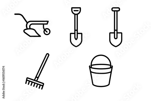 Set of gardening tools icons: shovel, rake, wheelbarrow, bucket