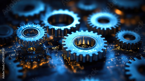 Set of glowing blue gears connected on a technological surface, symbolizing teamwork and advanced systems integration. Generated with AI.