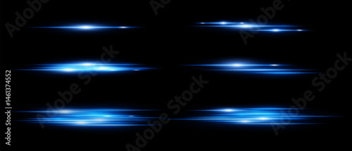 Set of glowing horizontal light streaks with motion blur effect on black background. Perfect for highlights, overlays, or dynamic transitions in design. Vector illustration.
