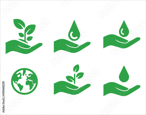 Set of green ecology icons representing eco friendly practices, conservation, renewable energy. Ideal for environmental awareness and clean energy themes.