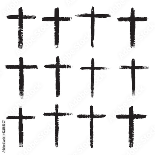Set of grunge hand drawn ink cross symbols. Christian crosses, religious signs, crucifix symbol, isolated on white background, textured. Vector.