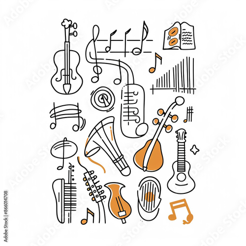 Set of hand drawn music theme isolated on white background, doodle set of Musical Instruments theme. Vector illustration