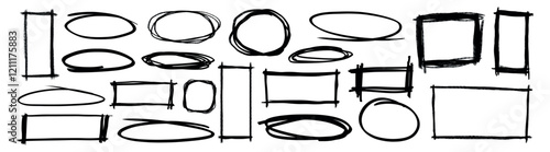 Set of hand-drawn circles and rectangles. Sketchy circles and rectangles in various styles. Doodle circles and rectangles for creative designs. Hand drawn doodle frames, vector set.
