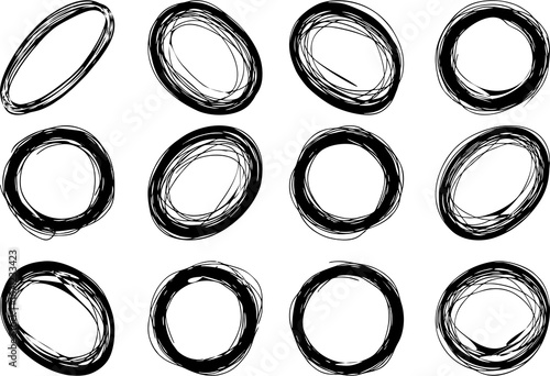 Set of hand-drawn circular Scribble Pattern frames. Blank circular frames on white. Easy to reuse on media and web.