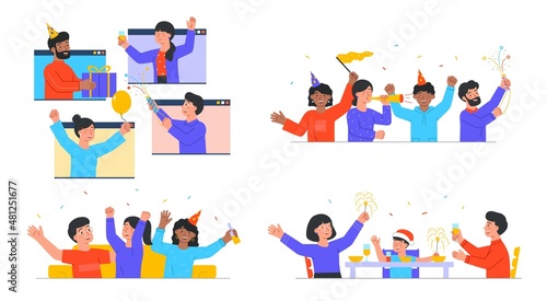 Set of happy people gathering together at holiday party. Young Men, women, friends and families relaxing and having fun. Offline entertainment or online meeting. Cartoon flat vector collection
