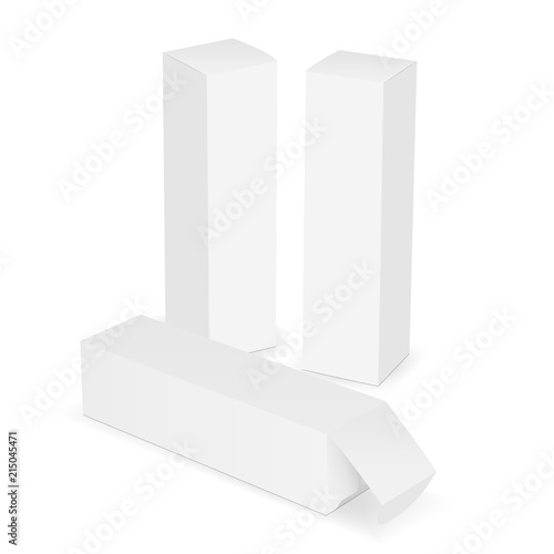 Set of high rectangular cardboard boxes isolated on white background. Vertical and horisontal mockups to displaying cosmetic or pharmaceutical packaging design