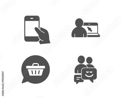 Set of Hold smartphone, Shopping cart and Online education icons. Communication sign. Phone call, Dreaming of gift, Internet lectures. Business messages. Quality design elements. Classic style
