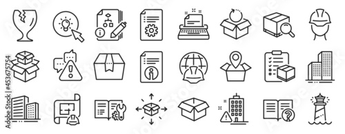 Set of Industrial icons, such as Parcel delivery, Algorithm, Package location icons. Packing boxes, Buildings, Technical documentation signs. Typewriter, Skyscraper buildings, Help. Energy. Vector