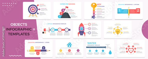 Set of infographic templates with different objects - target with arrows, heart, bulb, pencil, key to success