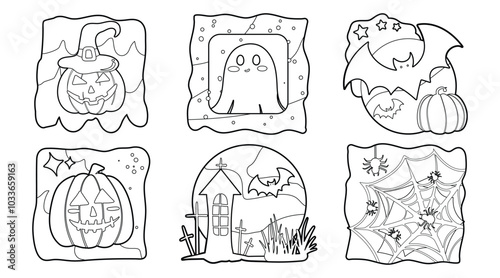 Set of isolated cute Halloween decoration elements for sticker, badge, tag or label on a transparent background, Volume 14: Black outline with white plain.
