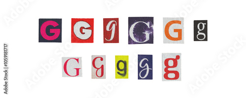 Set of isolated cut-out letter “G” from magazines on a transparent background, retro y2k style