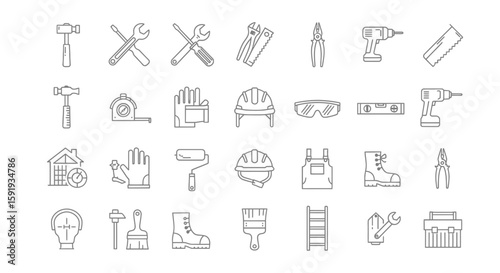 Set of line icons for diy tools and work clothes