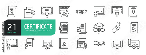 Set of Line Icons Related to Certificate, Diploma, Award, Authorization, Verification, and more.