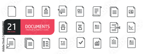 Set of line icons related to form document, report document, financial bill, application form, brochure. Outline icons collection. Editable stroke. Vector illustration.
