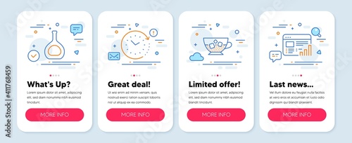 Set of line icons, such as Cognac bottle, Time change, Cold coffee symbols. Mobile screen banners. Web report line icons. Brandy alcohol, Clock, Ice cubes in beverage. Graph chart. Vector