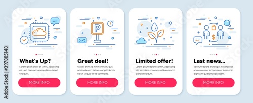 Set of line icons, such as Plants watering, Cloud computing, Parking symbols. Mobile screen mockup banners. Buying process line icons. Water drop, Computer storage, Auto park. Supermarket bag. Vector
