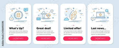 Set of line icons, such as Winner cup, Hypoallergenic tested, Calculator target symbols. Mobile screen app banners. Medical help line icons. Champion, Feather, Audit. Medicine laptop. Vector