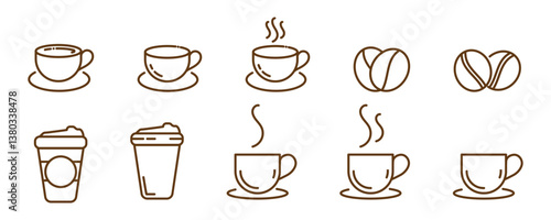 Set of linear coffee cup icons isolated on transparent background. Cup with saucer and steam, coffee beans line icons.