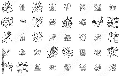 Set Of Linear Happy New Year Icons Silhouette Vector Logo Design Containing Party,Festival,New-Year,Happy-New-Year,Celebration Outline Icons Collection. Simple Vector Illustration