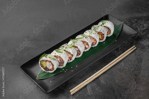 set of maki rolls with salmon tuna, shrimp, avocado, rice and green bamboo leaf in a black ceramic plate with chopstick on a dark gray textured background, side view