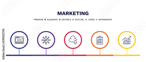 set of marketing thin line icons. marketing outline icons with infographic template. linear icons such as webcode, viral, download from cloud, checklist, trend vector.