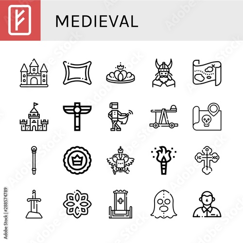 Set of medieval icons such as Rune, Castle, Crown, Viking, Treasure map, Scepter, Medieval, Catapult, Sceptre, Coat of arms, Torch, Orthodox cross, Sword, Throne, Executioner , medieval