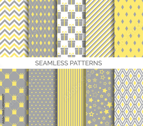 Set of minimal seamless patterns in yellow and gray colors of the 2021 year. Abstract geometric vector backgrounds