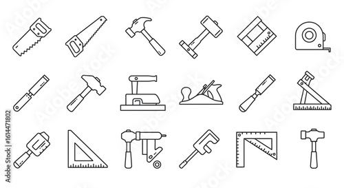 Set of minimal vector icons for woodworking tools depicting various carpentry equipment