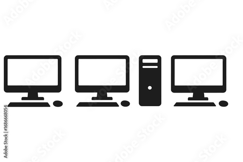 Set of minimalist desktop computer icons. PC monitor, screen, and mouse silhouettes. Vector graphic symbol for web, office, and technology concepts. Flat design illustration.