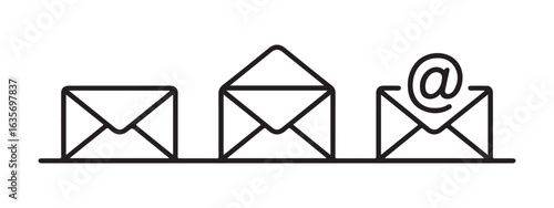 Set of minimalist line icons representing mail and email communication, including closed, open, and electronic mail envelopes.