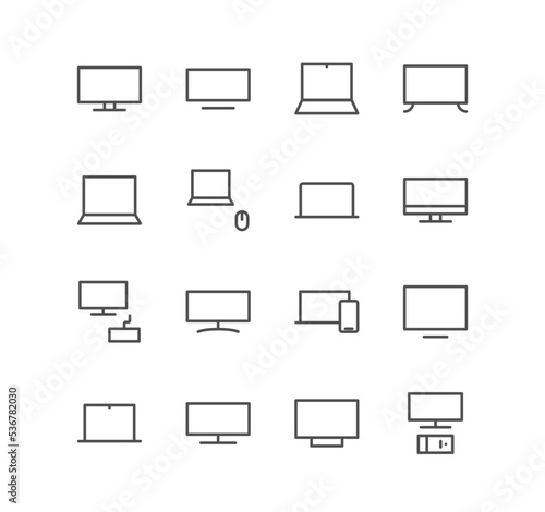 Set of monitor and computer icons, device, screen, laptop, phone, pc, and linear variety vectors.